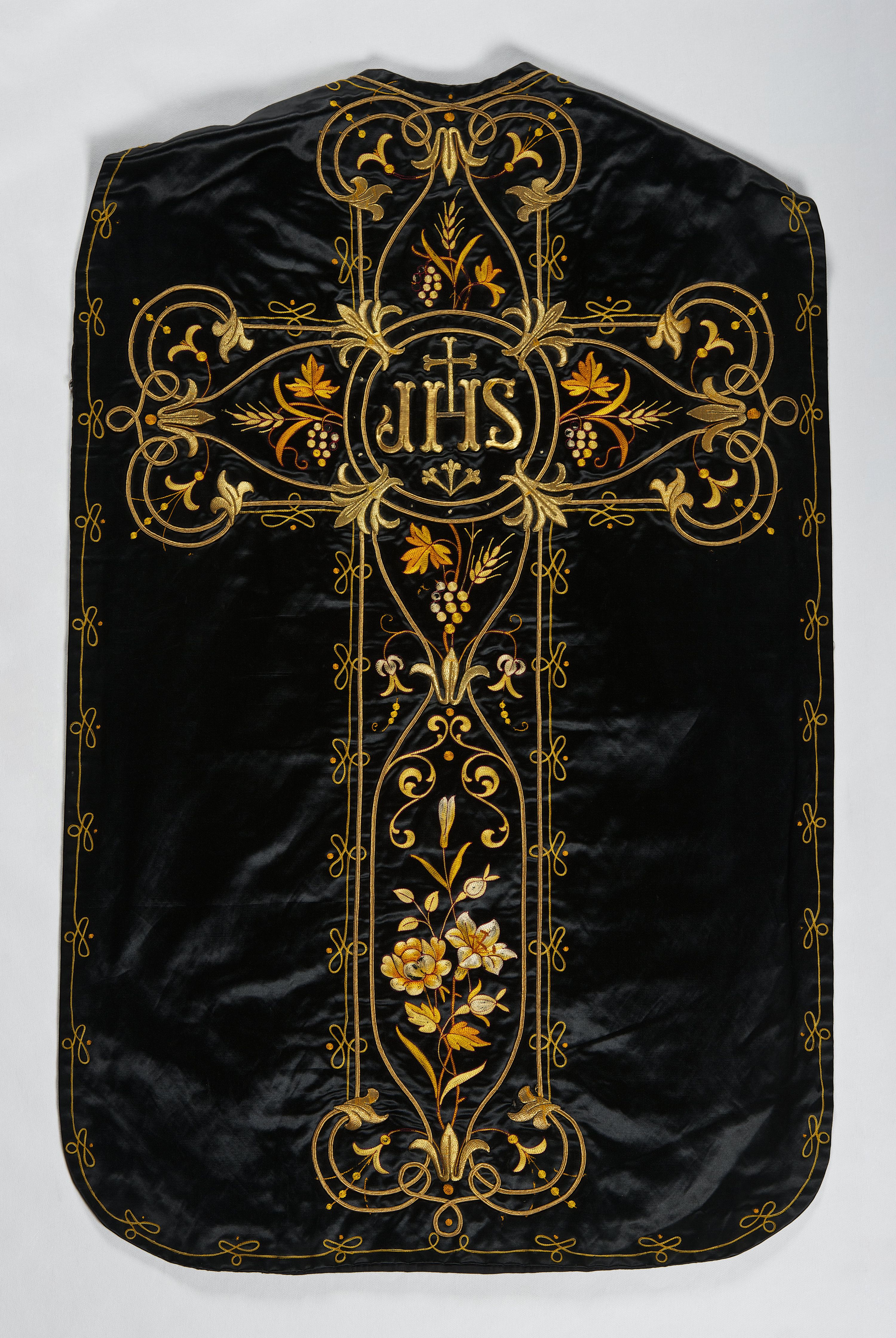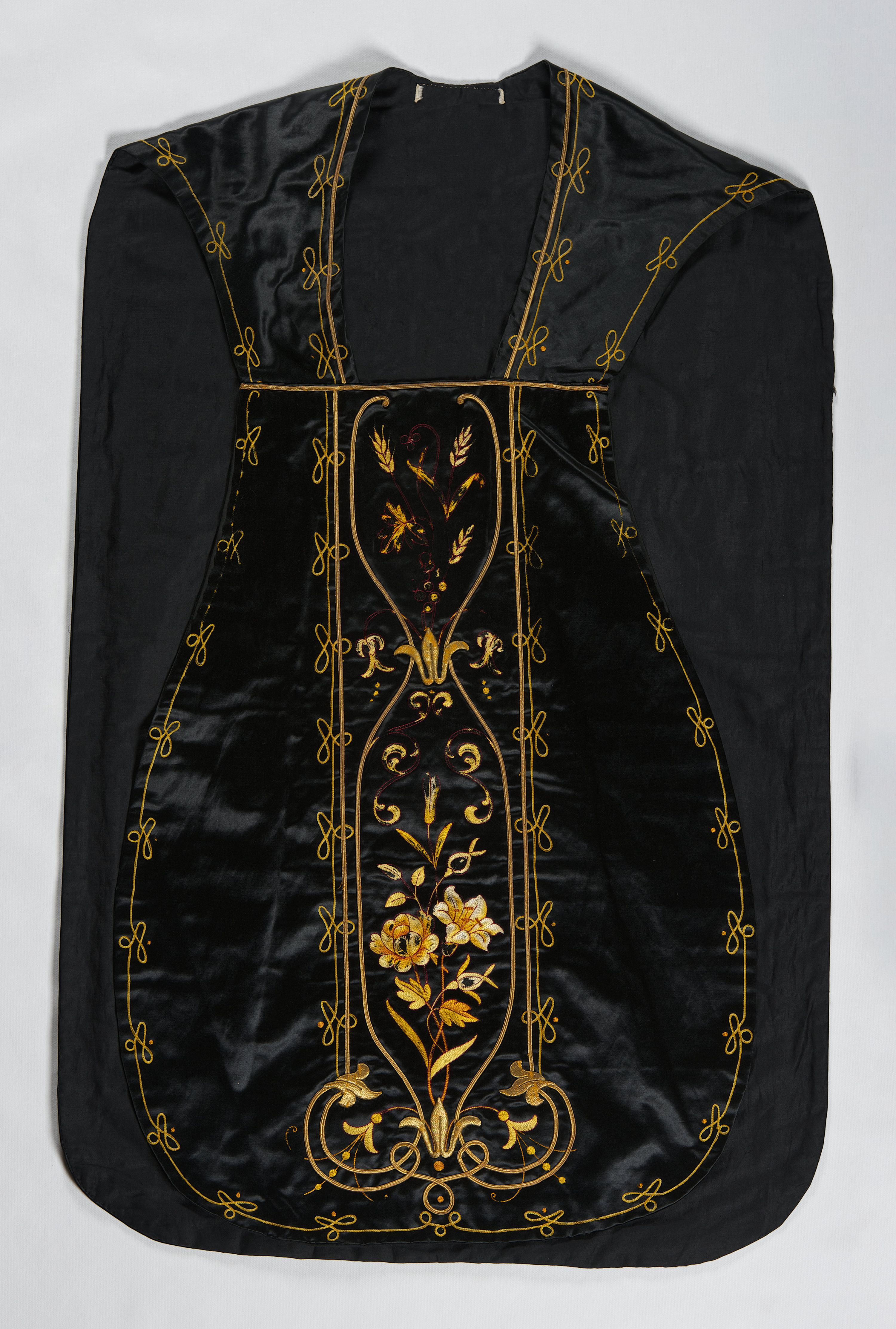 Ornat z czarnej tkaniny półjedwabnej o splocie atłasowym.
