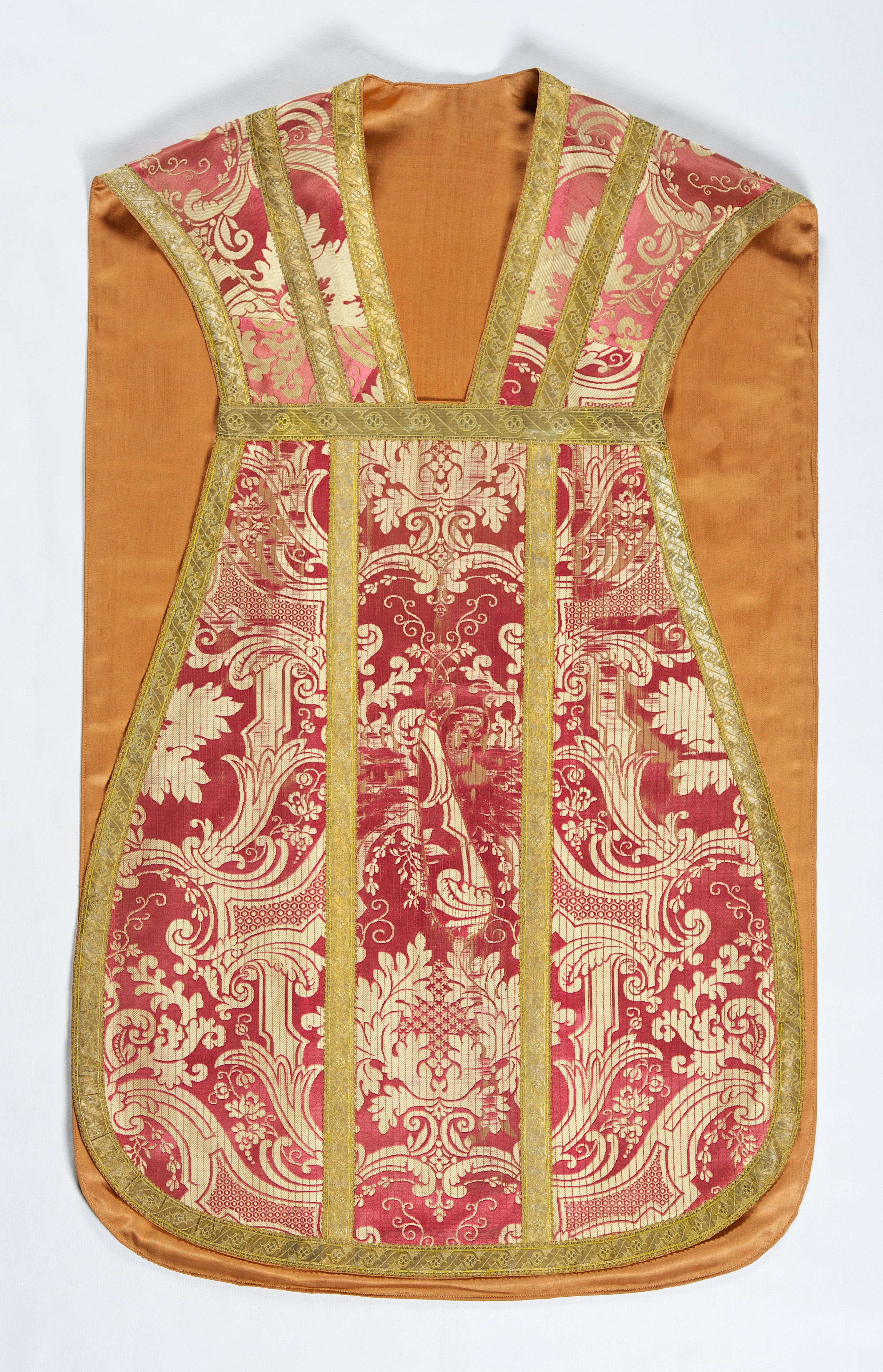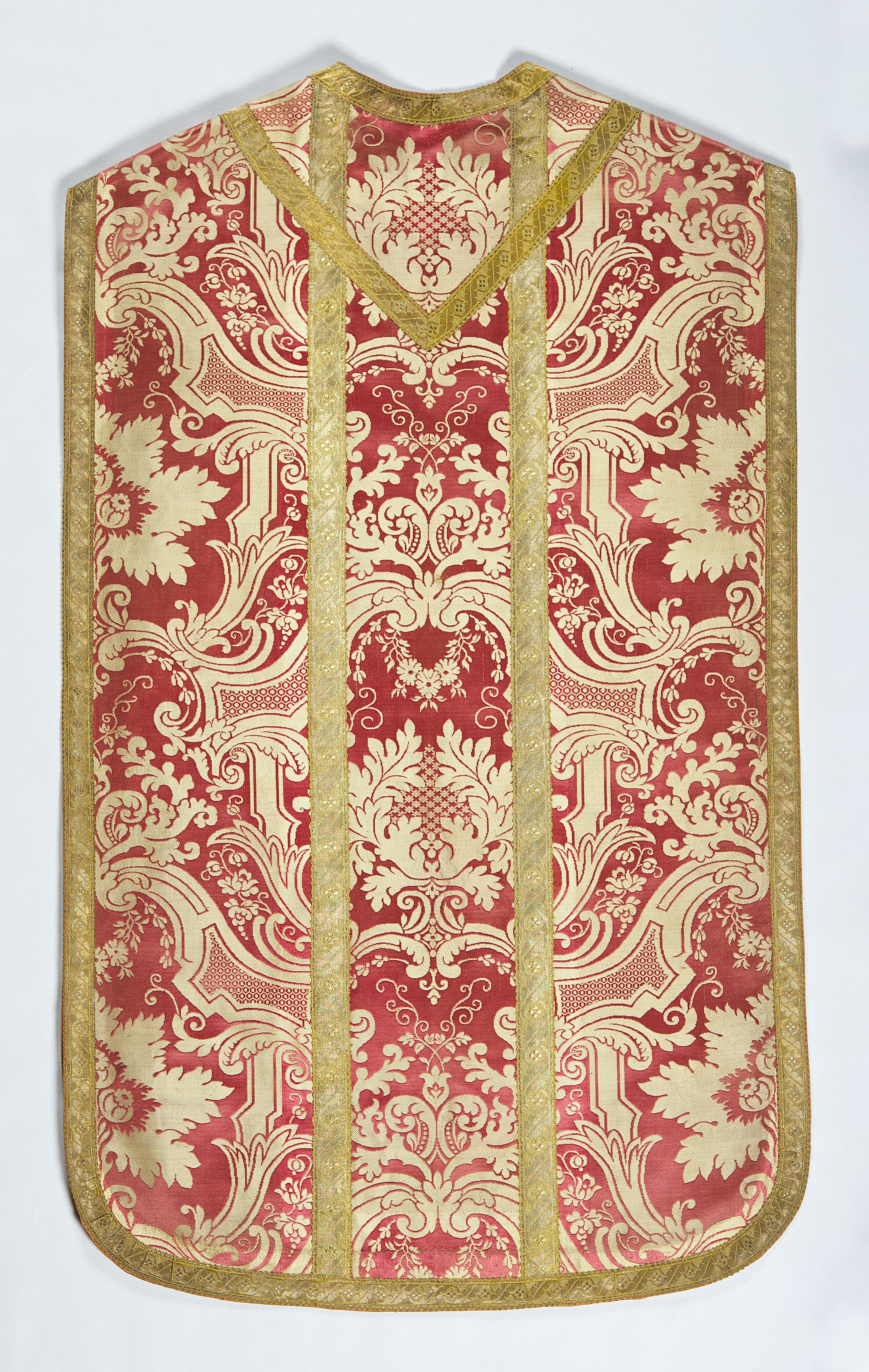 Ornat jednolity z czerwono-białej tkaniny półjedwabnej (?), żakardowej. Wzór o kompozycji sieciowej z motywem drobnych girland kwiatowych, rozłożystych centralnie umieszczonych układów roślinno-kwiatowych i elementów nawiązujących do ornamentu okuciowo-kartuszowego.